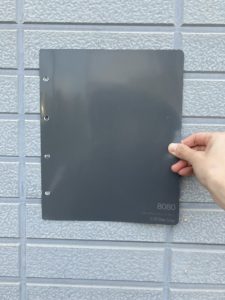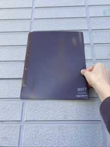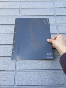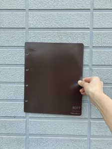 面積が広いと、明るい色は鮮やかに、暗い色は濃く見えます。小さなサンプルだけで選ぶと、実際の外壁と印象が異なることもあるため、できればA4サイズなど大きい色見本を見て決めましょう。